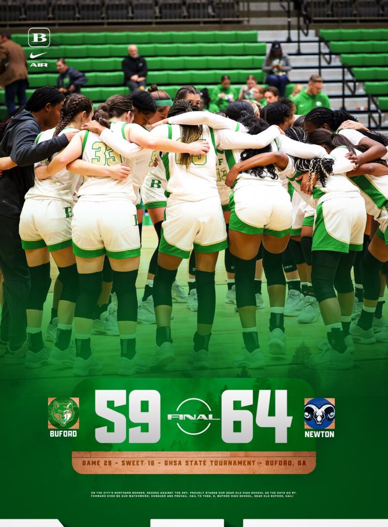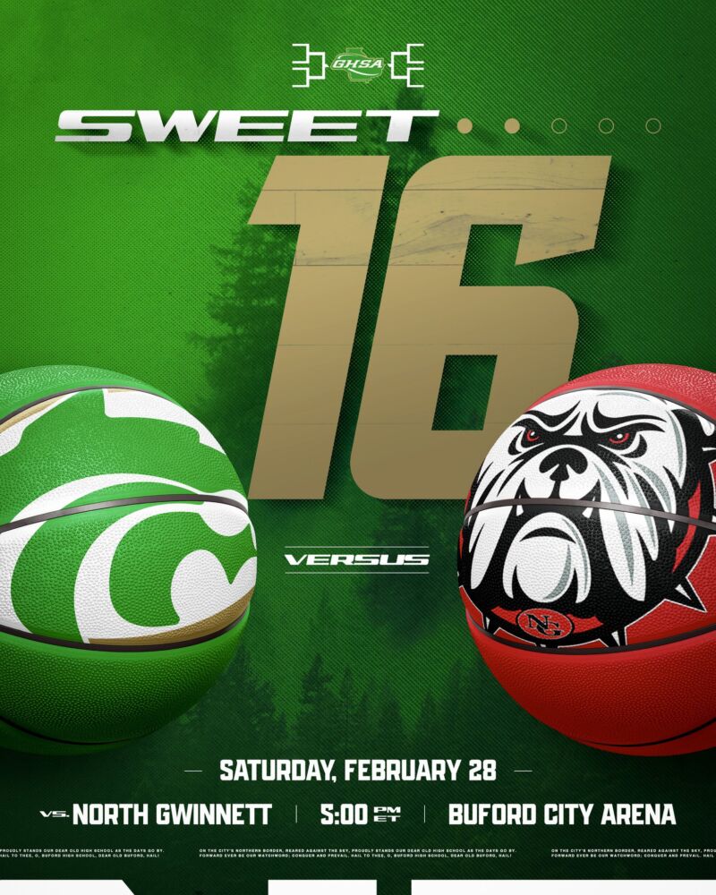 Buford advances to the Sweet Sixteen of the GHSA State Basketball Tournament. Be at Buford Arena Saturday as the Wolves play North Gwinnett! 🐺🏀